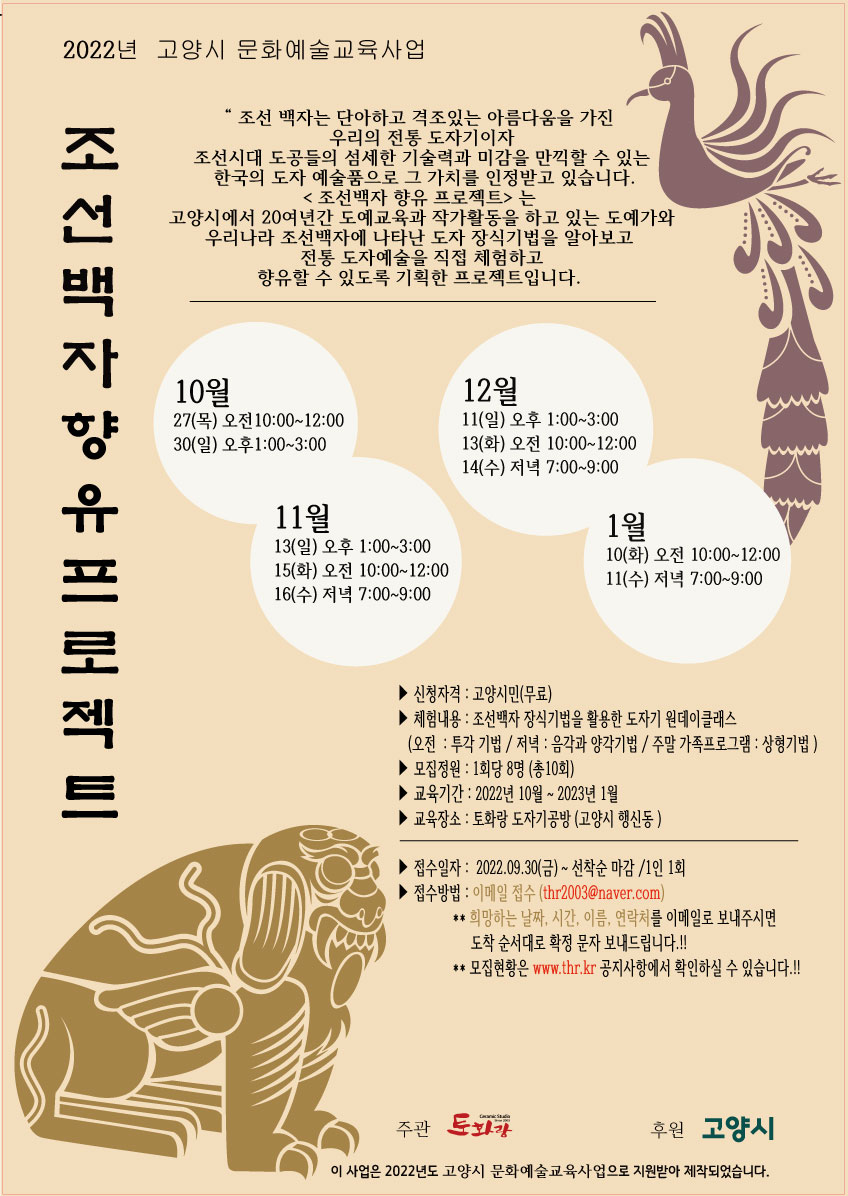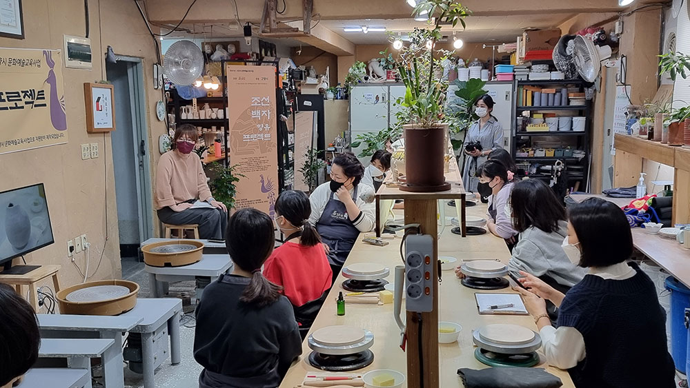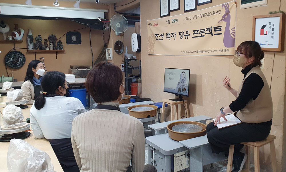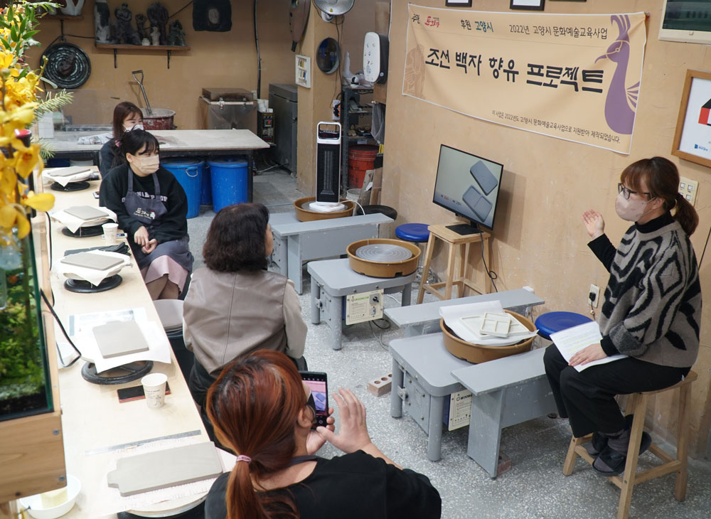 “ 조선 백자는 단아하고 격조있는 아름다움을 가진 우리의 전통 도자기이자 조선시대 도공들의 섬세한 기술력과 미감을 만끽할 수 있는 한국의 도자 예술품으로 그 가치를 인정받고 있습니다. < 조선백자 향유 프로젝트> 는 고양시에서 20여년간 도예교육과 작가활동을 하고 있는 도예가와 우리나라 조선백자에 나타난 도자 장식기법을 알아보고 전통 도자예술을 직접 체험하고 향유할 수 있도록 기획한 프로젝트입니다. ”